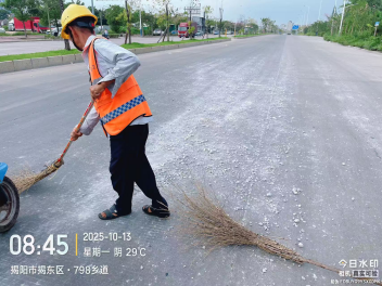 清理撒漏沙土 确保道路安全 来源:揭阳市揭东区环境卫生管理中心 发布时间:2025-10-13 09:36 浏览次数: - 【字体: