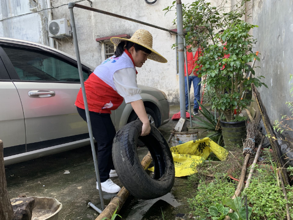 行动中,县行政服务中心党员、团员志愿者向村民派发预防基孔肯雅热宣传单,重点对村内主干道、背街小巷、沟渠池塘、废弃院落等区域进行彻底清扫。大家手持扫帚、火钳等工具,清除生活垃圾、杂草杂物,疏通堵塞沟渠;对房前屋后的积水容器、废旧轮胎、花盆托盘等蚊虫孳生地逐一排查,现场亲自动手和指导村民翻盆倒罐、清理积水,并对公共区域喷洒杀虫剂。针对部分行动不便的老人家庭,志愿者主动上门帮忙打扫庭院,用实际行动传递关怀。